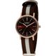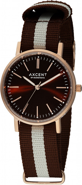 Axcent Vintage X7800R-25 rannekellossa on kaunis punakullanvärinen runko ruskealla kellotaululla ja tyylikäs ruskea-valkoraidallinen rannekke. Kellon ruon on valmistettu ruostumattomasta teräksestä ja sen leveys on 36mm. Muodikkaan kangasrannekkeen leveys on 18mm. Axcent kelloille myönnetään 2 vuoden takuu ja ne toimitetaan valmistajan alkuperäisessä rasiassa.