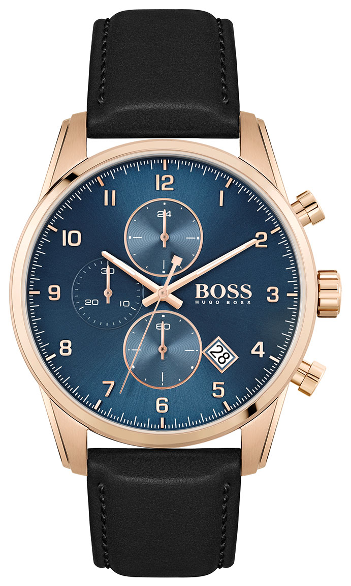 BOSS Skymaster Chronograph 1513783 -kronografikellossa on tyylikäs ja moderni ilme. Suuressa 44 mm leveässä kellotaulussa on sininen kellotaulu ja tyylikkäät osoittimet ja indeksit. Ruusukullanvärinen runko on 11 mm paksu. Kokonaisuuden kruunaa nahkasta valmistettu musta ranneke, jonka leveys kiinnityskohdasta on 22 mm. Kellotaulusta löytyy ajanotto, päivyri, ja 24 tunnin kello. Hugo Boss -kelloille myönnetään 2 vuoden takuu ja ne toimitetaan valmistajan alkuperäisessä pakkauksessa.