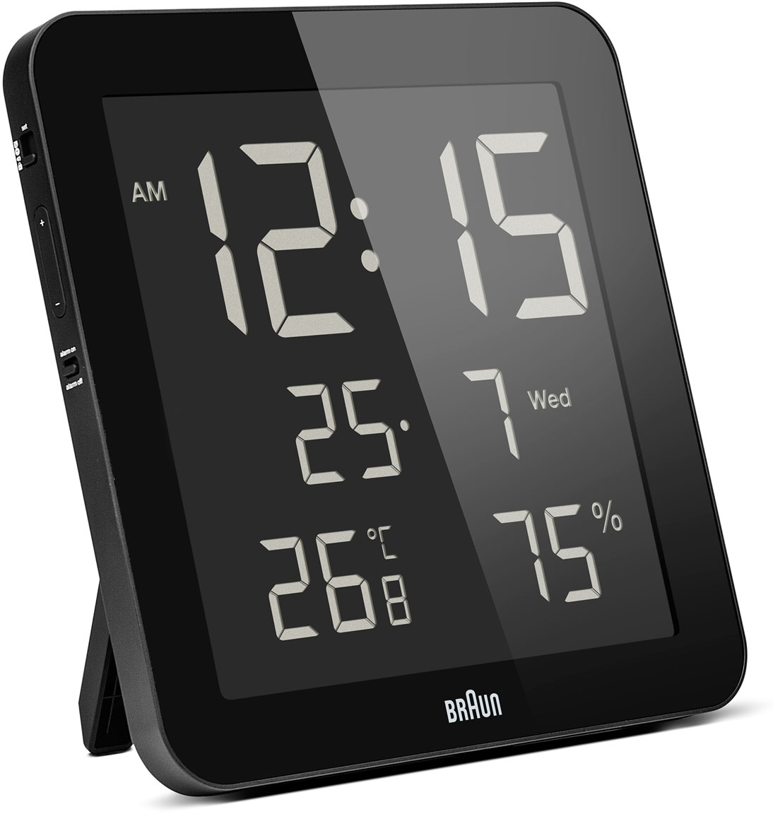 Tyylikäs mustan värinen Braun BNC014BK herätyskello toimii niin yöpöydälläsi kuin seinäkellonakin. Sen mitat ovat noin 21cm x 21cm x 2,3 cm, ja sen isolta näytöltä näkee selkeästi numerot. Tämä kello näyttää ajan, herätysajan, päivämäärän, viikonpäivän, sisälämpötilan ja huonekosteuden. Herätyskelloa on helppo käyttää ja voit itse valita näyttääkö kello 12 vai 24 tunnin ajan. Kellossa on taitettava tuki, joka pitää sen pystyssä yöpöydällä. Pakkauksessa tulee paristot mukaan. Kaikille Braun herätyskelloille myönnetään valmistajan virallinen 2 vuoden takuu, ja ne toimitetaan valmistajan alkuperäisessä pakkauksessa.