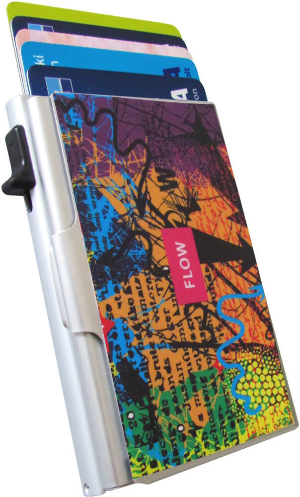 Bright time POP Flow -korttikotelossa on kätevä mekanismi, jolla kortit saa nousemaan kotelosta porrastetusti yhdellä painalluksella. Flow mallin kannessa on värikäs kuviointi. Alumiinikotelossa on tilaa kuudelle kortille. Alumiini kotelon kyljessä on etulokero, johon saat lisäksi lisäkortteja, käyntikortit ja kuitit. Kotelo on myös RFID suojattu, joten kortteja ei voi etälukea, kun ne ovat kotelon sisällä. Kotelon leveys on 63mm, paksuus 15mm ja korkeus 98mm. Bright Time lompakot toimitetaan kirjeitse. Lompakon mukana ei tule lahjarasiaa.