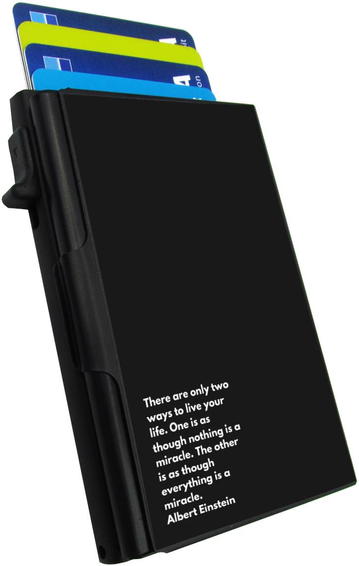 Bright Time POP Miracle korttikotelossa on kätevä mekanismi, jolla kortit saa nousemaan kotelosta porrastetusti yhdellä painalluksella. Alumiinikotelossa on tilaa kuudelle kortille. Alumiini kotelon kyljessä on etulokero, johon saat lisäksi lisäkortteja, käyntikortit ja kuitit. Kotelo on myös RFID suojattu, joten kortteja ei voi etälukea, kun ne ovat kotelon sisällä. Kotelon leveys on 63mm, paksuus 15mm ja korkeus 98mm. Bright Time lompakot toimitetaan kirjeitse. Lompakon mukana ei tule lahjarasiaa.