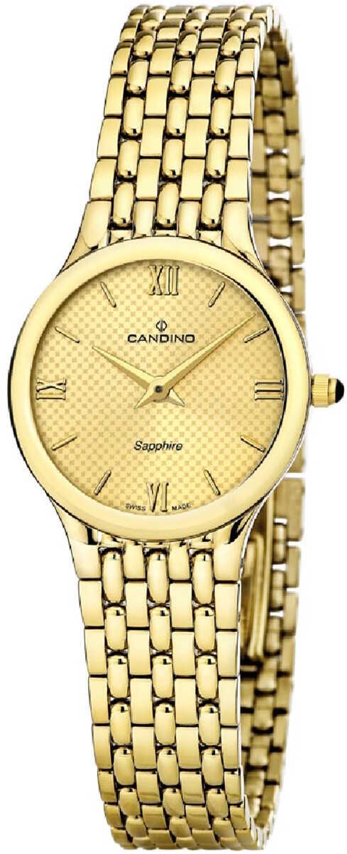 Upea naisten Candino C4365/3 rannekello. Kellon rungon leveys on 27mm ja rannekkeen leveys 13mm. Runko ja ranneke on valmistettu ruostumattomasta teräksestä ja ne ovat kullan väriset. Kellossa on safiirilasi, joka on todella kestävä. Candino kelloille myönnetään kahden vuoden takuu ja ne toimitetaan valmistajan alkuperäisessä rasiassa.