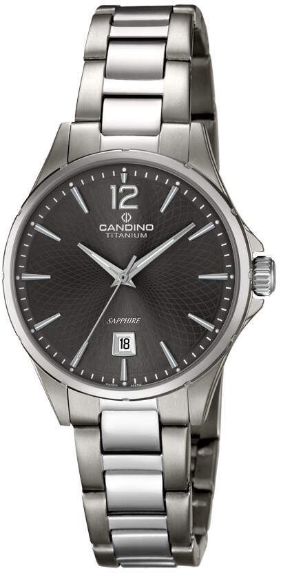 Sveitsiläisessä Candino C4608/3 Titanium kellossa on päivyri, selkeä kellotaulu ja kestävä safiirilasi. Lisäksi kello on 50m vesitiivis ja titaanirungon ja rannekkeen ansiosta todella kevyt. Tässä mallissa on harmaa kellotaulu. Kellon rungon leveys on 31mm ja paksuus 8mm. Rannekkeen leveys kiinnityskohdasta 14mm. Candino kelloille myönnetään 2 vuoden takuu ja ne toimitetaan valmistajan alkuperäisessä rasiassa.