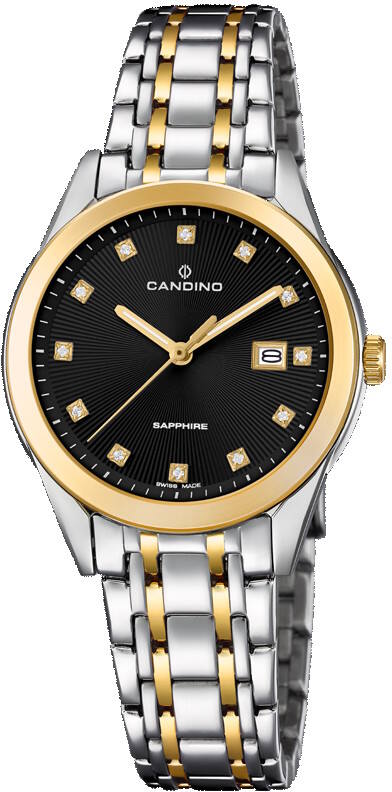 Candino C4695/3 Sapphire -kellossa on kullanvärinen kellotaulu, kaksivärinen teräsranneke ja kestävä safiirilasi. Kellotaulussa on indekseinä kirkkaat zirconia korukivet. Kellon rungon leveys 33mm ja paksuus 8mm. Rannekkeen leveys kiinnityskohdasta 16mm. Candino kelloille myönnetään 2 vuoden takuu ja ne toimitetaan valmistajan alkuperäisessä rasiassa.
