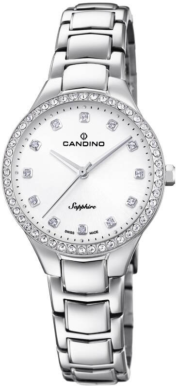 Candino C4696/2 on laadukas Sveitsiläinen naisten kello. Kellon runko ja ranneke ovat valmistettu ruostumattomasta teräksestä. Kellotaulun ympärystää ja indeksejä koristavat kirkkaat zirconia korukivet. Hopeanväristä kellotaulua suojaa kestävä safiirilasi. Kellon rungon leveys on 30mm ja paksuus 7.5mm. Candino-kelloille myönnetään 2 vuoden takuu ja ne toimitetaan valmistajan alkuperäisessä pakkauksessa.