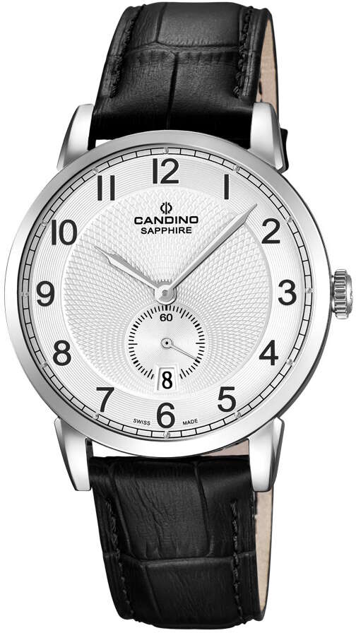 Candino Sapphire C4591/1 kellossa on kestävä safiirilasi. Mallissa on hopeanvärinen selkeä kellotaulu ja musta nahkaranneke. Kellon rungon leveys on 41mm ja rungon paksuus 8mm. Rannekkeen leveys kiinnityskohdasta 20mm. Candino kelloille myönnetään 2 vuoden takuu ja ne toimitetaan valmistajan alkuperäisessä rasiassa postikuluitta!