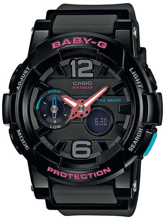 Casio Baby-G BGA-180-1BER on musta naisten kello värikkäillä yksityiskohdilla. Kellossa on taustavalo, maailmanaika, lämpömittari, vuorovesitiedot, kuunvaihetiedot, ajastin, ajanotto, hälytys, tasatuntisignaali, ikuinen kalenteri, 12/24h näyttö ja malli on lisäksi iskunkestävä. Kellon rungon leveys on 44mm ja paksuus 15,4mm. Kellon paino 46 grammaa. Casio kelloille myönnetään 2 vuoden takuu ja ne toimitetaan valmistajan alkuperäisessä rasiassa.