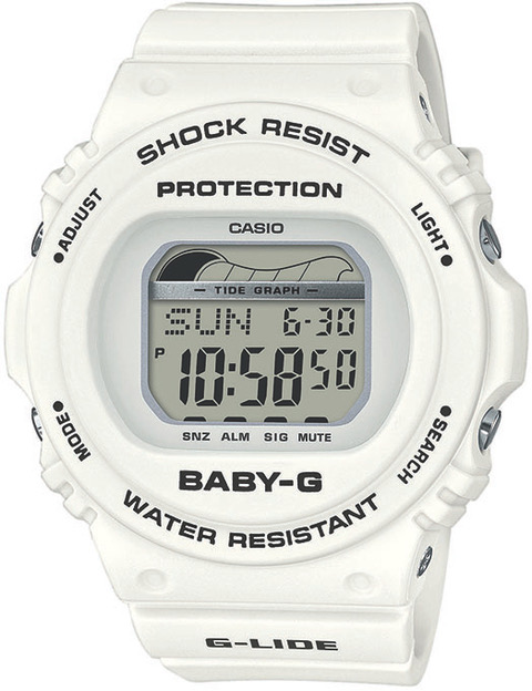 Casio BABY-G G-LIDE BLX-570-7ER-rannekello on suunniteltu aktiiviselle käyttäjälle, joka viihtyy eritoten veden äärellä. Iskunkestävään pienikokoisessa G-lide-kellossa on perinteiset ominaisuudet kuten ikuinen kalenteri, 12/24 tunnin ajannäyttö, maailmanaika ja ajastin, ja näiden lisäksi kelloon on mahdollista asettaa muun muassa vuorovesiajastus, jolloin kello näyttää käyttämäsi aikavyöhykkeen vuoroveden ajan. Kellossa on myös purjehdusajastin ja kuunkalenteri. Kello on vesitiivis 20 metriin saakka (ISO 22810 sertifioitu) ja valmistettu kevyestä polyuretaanista.