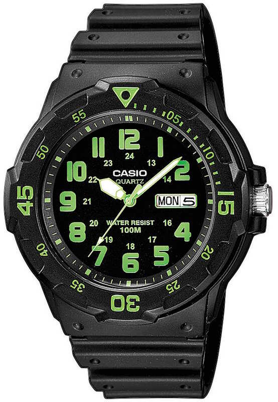 Casio Collection MRW-200H-3BVEF kellossa on muodikas sukelluskello design. Kellon rungon leveys on 44,6 mm ja paksuus 11,6 mm. Kellon rannekkeen leveys on 18mm. Kellossa on musta taulu vihreillä indekseillä ja kellon paino on 39 grammaa. Kello toimitetaan valmistajan alkuperäisessä rasiassa. Casio kelloille myönnetään 2 vuoden takuu.