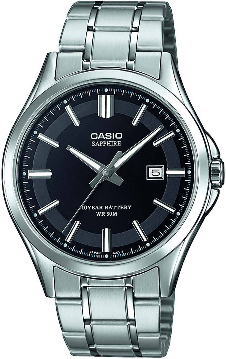 Casio Collection Sapphire MTS-100D-1AVEF -rannekelloa kuvaillessa loppuvat helposti ylistyssanat kesken. Tämä on ehdottomasti yksi hintaluokkansa tyylikkäimmistä ja luotettavimmista miesten kelloista! Safiirilasi, ruostumaton 41 mm teräsrunko ja peräti 10 vuotta kestävä paristo ovat merkkejä korkeasta laadusta, jota voit kellolta odottaa. Viisareissa ja indekseissä loistaa pimeän tullen niiden kirkas luminointi. Mukana mustapohjaisessa taulussa on myös kätevä päivyrinäyttö.