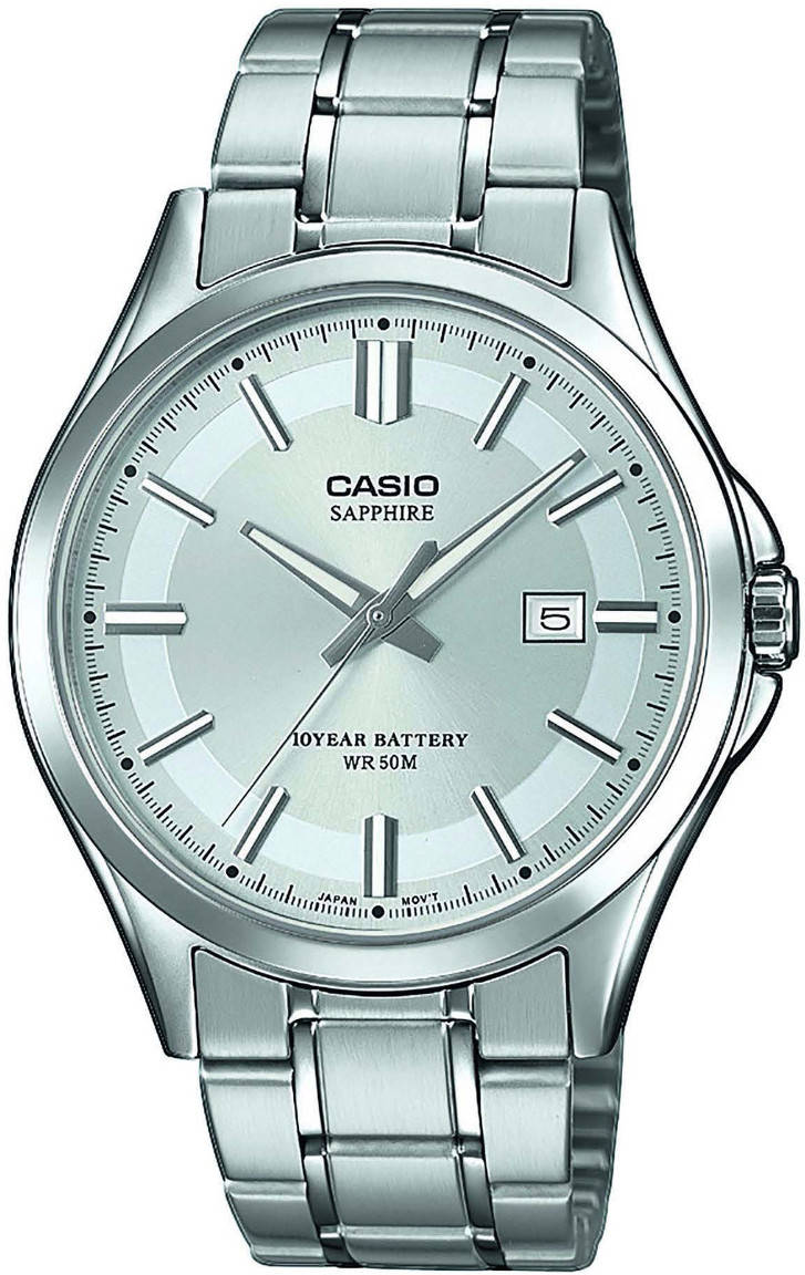 Casio Collection Sapphire MTS-100D-7AVEF -rannekelloa kuvaillessa loppuvat helposti ylistyssanat kesken. Tämä on ehdottomasti yksi hintaluokkansa tyylikkäimmistä ja luotettavimmista miesten kelloista! Safiirilasi, ruostumaton 41 mm teräsrunko ja peräti 10 vuotta kestävä paristo ovat merkkejä korkeasta laadusta, jota voit kellolta odottaa. Viisareissa ja indekseissä loistaa pimeän tullen niiden kirkas luminointi. Mukana hopeanvärisessä taulussa on myös kätevä päivyrinäyttö.