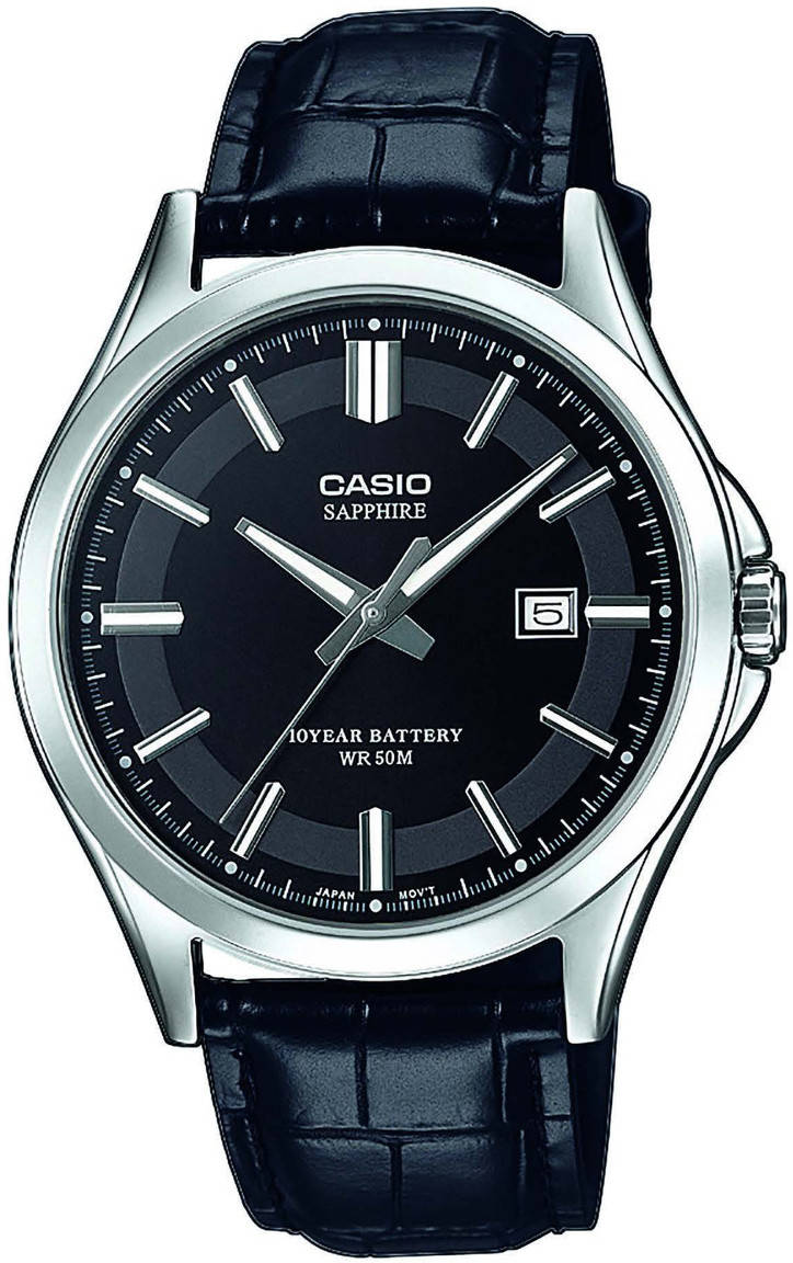 Casio Collection Sapphire MTS-100L-1AVEF -rannekelloa kuvaillessa loppuvat helposti ylistyssanat kesken. Tämä on ehdottomasti yksi hintaluokkansa tyylikkäimmistä ja luotettavimmista miesten kelloista! Safiirilasi, aito nahkaranneke, ruostumaton 41 mm teräsrunko ja peräti 10 vuotta kestävä paristo ovat merkkejä korkeasta laadusta, jota voit kellolta odottaa. Viisareissa ja indekseissä loistaa pimeän tullen niiden kirkas luminointi. Mukana mustapohjaisessa taulussa on myös kätevä päivyrinäyttö.