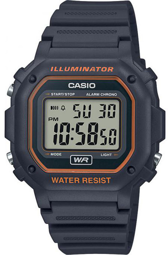 Kulmikas muotoilu ei ole koskaan näyttänyt näin hyvältä! Casio Digital F-108WH-8A2EF -rannekellon runko on 42,6 mm leveä ja pitää sisällään muutamia todella näppäriä ominaisuuksia. Päivittäiset hälytykset, automaattinen kalenteri sekä 60 min asti yltävä, sadasosien tarkkuudella mittaava sekuntikello tulevat varmasti jokaiselle joskus tarpeeseen. Kellon koneisto on mallia 3224 ja sen akunkesto on jopa 7 vuotta! Digitaalinäyttöä valaisee laadukas LED-valo.