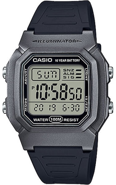 Mustaan ja harmaaseen verhoutunut Casio Digital W-800HM-7AVEF on kevyt ja monipuolinen miesten rannekello, jonka akku kestää jopa 10 vuotta. 24 h kestävä sekuntikello väliajoilla sekä kattavat hälytysvaihtoehdot mm. torkkutoiminnolla ovat näppäriä ominaisuuksia päivittäiseen käyttöön. Voit asettaa kelloon tasatuntisignaalin ja esim. joka päivä/kuukausi samaan aikaan soivan hälytyksen. Syntymäpäivien muistamiseen auttavat päivämäärähälytykset. Mukana myös keltavihreä LED-taustavalo ja kaksoisaikanäyttö. 10 ATM -luokituksen omaavana tämä kello kädessä uiminenkaan ei ole ongelma. Saatavilla myös maastonvihreänä.