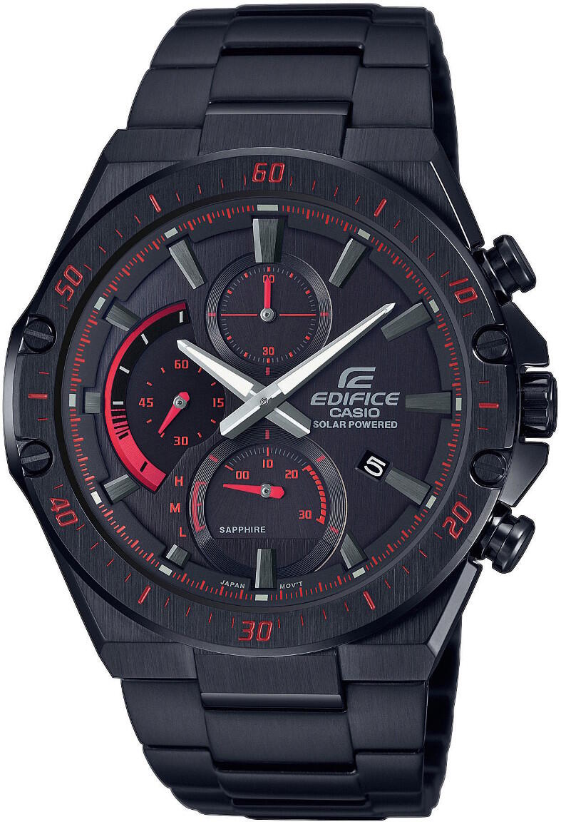 Casio Edifice EFS-S560DC-1AVUEF Solar Sapphire -rannekello on solar-koneiston ansiosta ympäristö ystävällinen ja kestävä kumppani. Kellon ruostumatonta 49 mm:iä leveää teräsrunko kiertää musta kellokehä, ja kellon oikeassa laidassa on näyttävät säätöpainikkeet. Kellotaulussa on päivämääränäyttö ja ajanotto ja kellotaulua suojaa naarmuuntumaton safiirilasi. Ranneke on ruostumatonta terästä ja rannekkeen kiinnityskohdan leveys on 22 mm:iä.