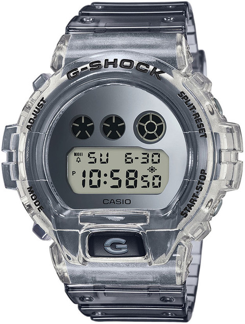 Casio G-SHOCK DW-6900SK-1ER Super Slear Skeleton-rannekello vangitsee 1980-luvun ilmeen yhdistäen sen moderneihin nykytrendeihin sopiviin piirteisiin ja G-shockin iskunkestäviin ominaisuuksiin. Kellossa on tyylikäs läpikuultava harmaa muoviranneke ja kellotaulussa metallinhohtoinen peililasi ja digitaalinen näyttö, jossa on useita ominaisuuksia ajanotosta multihälytykseen ja automaattiseen kalenteriin. Kellotaulua valaisee sinivihreä LED-valo.