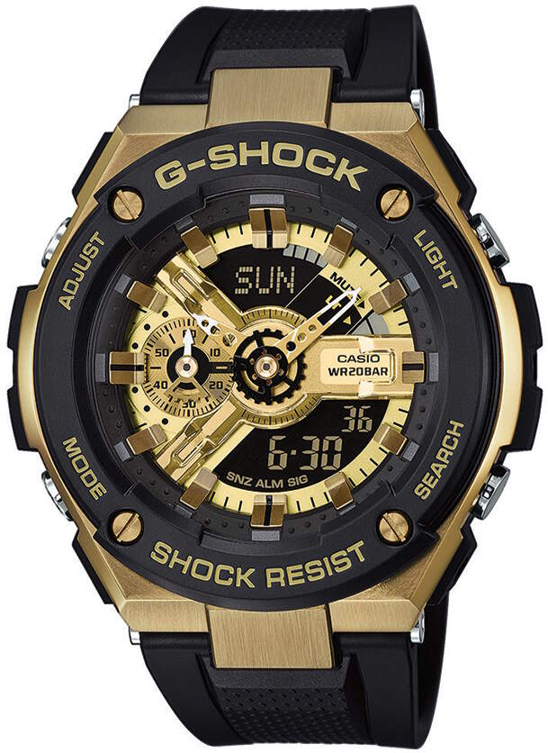Casio G-Shock G-Steel GST-400G-1A9ER -kellossa on näyttävät kullanväriset yksityiskohdat. GST-400 sarjan kelloissa on uusina ominaisuuksina ajanotto 1000 tunnin mittaus kapasiteetilla ja ISO764 standardin mukainen suojaus magnetisoitumista vasteen. Kellon rungon leveys 52.4 mm ja paksuus 16,1 mm. Kello saa käyntivoimansa auringon valosta. Muita ominaisuuksia: LED-taustavalo, iskunkestävä, maailmanaika, ajastin, ajanotto, 5 hälytystä, tasatuntisignaali, näppäinäänet päälle/pois, ikuinen kalenteri, 12/24h näyttö, vesitiiveys 200m ja paino 97 grammaa. Casio kelloille myönnetään 2 vuoden takuu ja ne toimitetaan valmistajan alkuperäisessä rasiassa.
