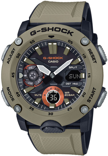 Casio G-SHOCK GA-2000-5AER Utility Color-rannekellossa on käytännöllisesti muotoiltu kellotaulu, kolme näyttöä ja erittäin kestävä hiilikuituvahvistettu runko. Kellossa on tuttu G-shockin iskunkestävä rakenne ja se on valmistettu vihreästä polyuretaanista.