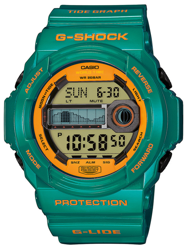 Casio G-Shock sarjan iskunkestävä Casio G-Shock GLX-150B-3ER rannekello. Kellossa LED-taustavalo, vilkkuhälytys, torkkuherätys, kuunvaiheet, vuorovesi, kalenteri, maailmanaika, 12/24 tunnin näyttö, ajastin, ajanotto/sekkari ja 3 hälytystä. Kellon rungon leveys on 52mm. Polyuretaanirannekkeen leveys 22mm ja kellon vesitiiveys on 200m. Casio kelloille myönnetään 2 vuoden takuu. Tuote toimitetaan valmistajan alkuperäisessä rasiassa.