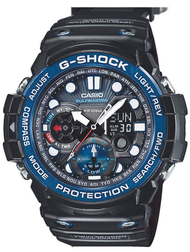 Casio G-Shock GN-1000B-1AER Gulfmaster on suunniteltu kestämään kaikki merenkulun koitokset. Merenkäyntiä varten kellossa on monia ominaisuuksia, kuten suuntima (digitaalinen kompassi), vuorovesitiedot, kuunkierto ja lämpömittari. Muita ominaisuuksia ovat LED taustavalo, maailmanaika, ajanotto, ajastin, 5 hälytystä, tasatuntisignaali, ikuinen kalenteri sekä 12/24h näyttö. Kellon rungon leveys on 53,4mm ja paksuus 15,9mm. Kello painaa 101 grammaa. Casio kelloille myönnetään 2 vuoden takuu ja ne toimitetaan valmistajan alkuperäisessä rasiassa.