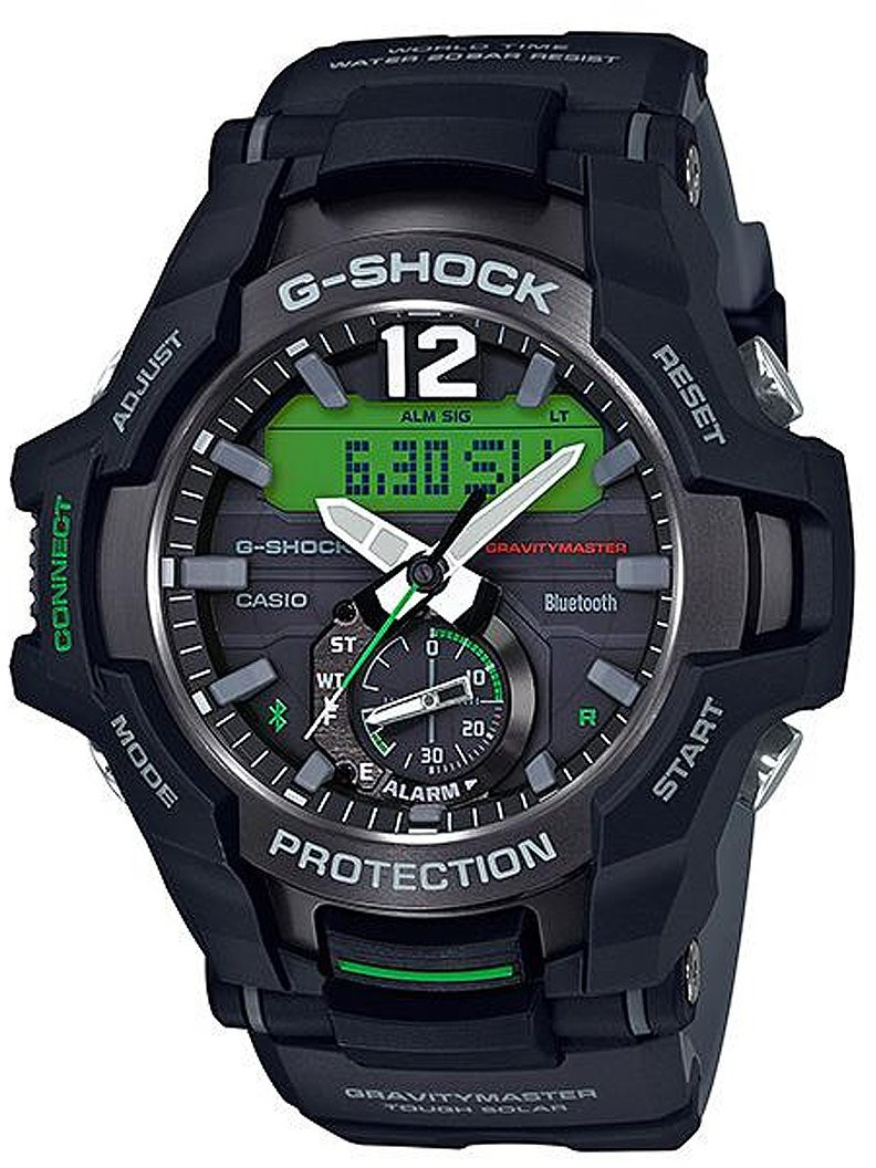 Kirkkailla LED-valoilla varustetut digitaalinäyttö ja viisarit muodostavat helposti tulkittavan kellotaulun silloinkin, kun lento käy kiivaimmillaan. G-Shock -mallistossa ensimmäistä kertaa nähtävät 7x33 pikselin LCD-näyttö ja PVD-pinnoitettu teräksinen bezel puhuvat omaa kieltään kellon korkeasta laadusta. Lentoaikojen suunnittelu on vaivatonta etupuolen valolla varustetun painikkeen ja viiden sivupainikkeen ansiosta. Bluetoothin ja G-Shock Connected -sovelluksen avulla voit käsitellä erittäin monipuolisesti sekä lentotietoja että kellon hälytyksiä, ajastimia ja muita asetuksia.
