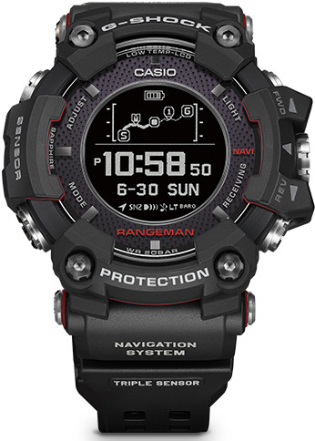 Casio G-Shock Rangeman GPR-B1000-1ER Solar GPS Navigation Bluetooth on maailman ensimmäinen kello, joka toimii valolautauksella ja jossa on GPS navigaatio ominaisuus. Tässä kellossa on valtava määrä ominaisuuksia. Katso video ja ominaisuudet videon alta. Kellon rungon leveys 57,7 mm ja paksuus 20,2 mm. Paino 142 grammaa. Casio kelloille myönnetään 2 vuoden takuu ja ne toimitetaan valmistajan alkuperäisessä rasiassa.