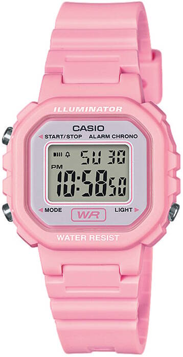 Casio LA-20WH-4A1EF on siro digitaalikello naisille. Tässä kauniissa vaaleanpunaisessa mallissa on vaalea digitaalinäyttö. Kellon rungon leveys 30,4mm ja paksuus 8,6mm. Kellossa ominaisuuksina taustavalo, ajanotto, hälytys, automaattinen kalenteri ja 12/24h näyttö. Casio kelloile myönnetään 2 vuoden takuu ja ne toimitetaan valmistajan alkuperäisessä rasiassa.