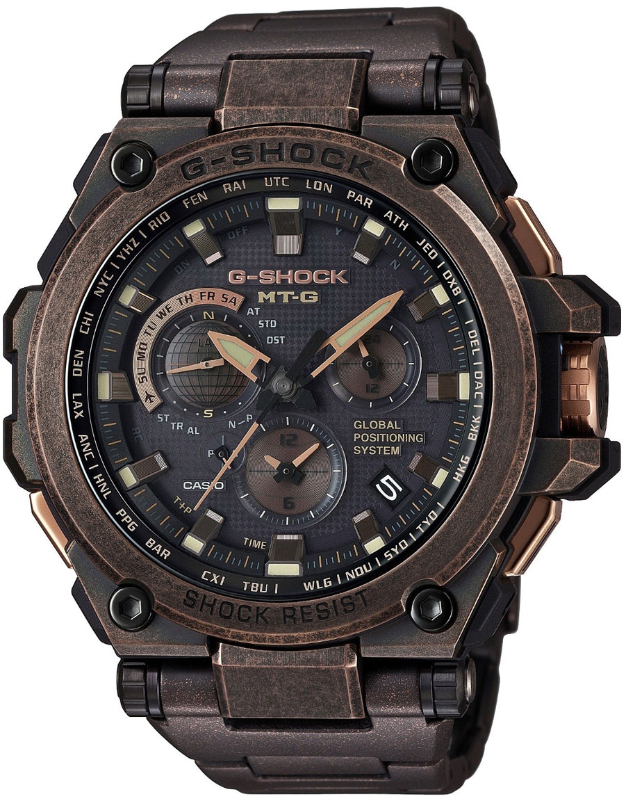 Casio MT-G GPS G-Shock MTG-G1000AR-1AER Sunken Treasure -rannekello kuuluuu äärimmäisiin olosuhteisiin ja kovaan käyttöön tarkoitettuun Casion MT-G eli Metal Twisted G-Shock -tuotesarjaan. Rannekello kestää iskuja, latautuu valosta ja saa aikansa GPS signaalista sekä radiosignaalista. Kello on MTG sarjan erikoismalli, johon on luotu erikoistekniikalla näyttävä pinta.