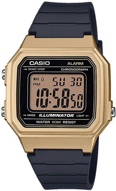 Casio Vintage W-217HM-5AVEF kuuluu suosittuun Vintage-mallistoon. Brändin ikoninen suorakulmainen muotoilu on yhdistetty suureen LCD-näyttöön. Kello on varustettu laadukkailla LED-valolla ja jopa 7 vuotta kattavalla paristolla. Moderni värimaailma sopii asuun kuin asuun. Kellossa on tyylikäs harjatun kullanvärinen runko ja musta kevyt muoviranneke. Ajaton muotoilu tekee kellosta pitkäikäisen asusteen.