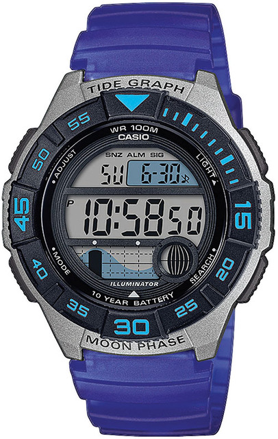Casio WS-1100H-1AVEF Marine design for Men's on monipuolinen vedenkestävä urheilukello. Täysin polyuretaanista valmistetussa kellossa on violetinsininen ranneke ja akryylilasilla suojattu LCD-näyttö sisältäen erilliset näytöt vuorovesinäytölle, kellolle ja päivyrille. Kello kestää vettä 100 m saakka, ja lisäksi kellossa on kuun vaiheisiin perustuva kalenteri, ajantotto, mahdollisuus lisätä toinen aikavyöhyke, 3 automaattista hälytystä, torkku, automaattinen kalenteri, sekä pyörivä kellokehä ja taulua valaiseva oranssi LED-valo. Casio-kelloilla on kahden vuoden takuu ja ne toimitetaan valmistajan alkuperäisessä pakkauksessa.