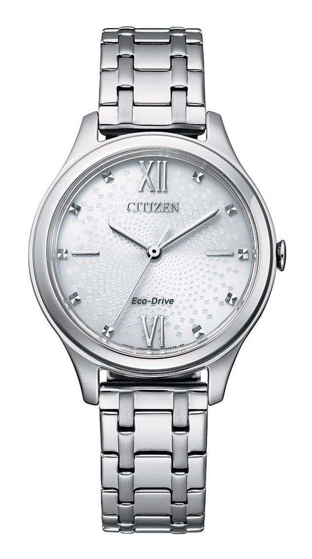 Citizen Eco-Drive EM0500-73A on tyylikäs ja ajaton naisten Eco-Drive -rannekello hopeanvärisellä teräsrannekkeella. Kellon E031-koneisto toimii valon voimalla. Akun varauksen kesto täydellä latauksella on hulppeat 180 päivää. Yhden vuorokauden käyntiin tarvittava sähköenergia saadaan pitämällä kelloa pari minuuttia valossa. Ruostumattomasta teräksestä valmistettu runko on 32 mm leveä. Mineraalilasi suojaa rannekellon valkoista kellotaulua. 100 m vesitiiveys takaa moitteettoman toiminnan myös uimassa käynnin jälkeen.
