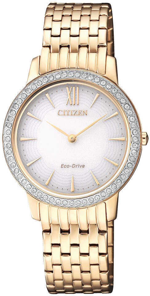 Kullanvärinen Citizen Eco-Drive EX1483-84A on elegantti naisten kello, jonka kellotaulun reunaa kiertävät kirkkaat zirconia korukivet. Rungon leveys on 29,5mm ja ja paksuus 6,5mm. Rannekkeen leveys kiinnityskohdasta 14mm. Citizen Eco-Drive- kellot toimivat valon voimalla ja lataavat käyntivirtaa ympäristöystävälliseen titaani-litium-ioni-akkuun. Yhden vuorokauden käyntiin tarvittava sähköenergia saadaan pitämällä kelloa pari minuuttia valossa. Citizen-kelloilla on kahden vuoden takuu, jonka voit pidentää kolmeen vuoteen rekisteröimällä Citizen-kello -sivulla .