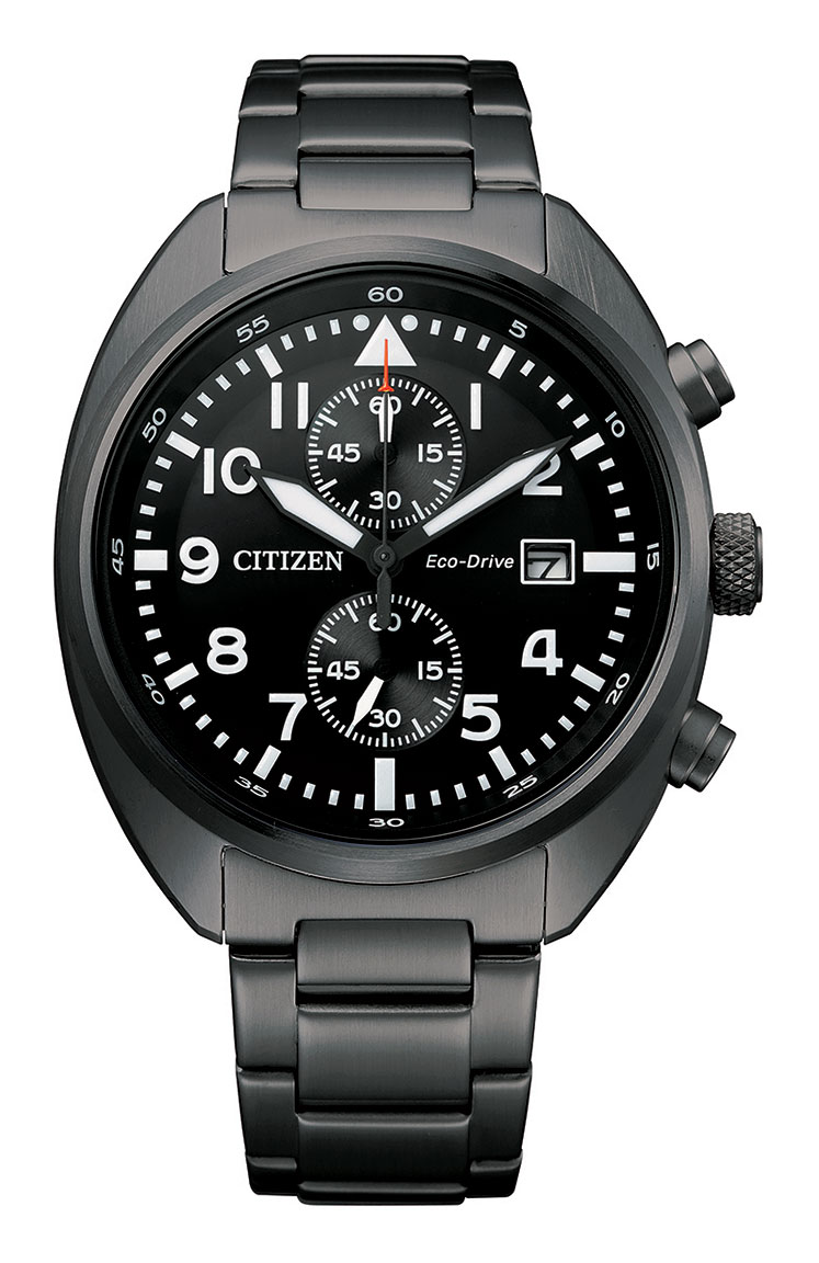 Citizen Eco-Drive Pilot Chronograph CA7045-14E on tyylikäs miesten lentäjänkello harmaanvärisellä teräsrannekkeella. Ruostumattomasta teräksestä valmistettu rannekellon runko on 42 mm leveä. Mineraalilasi suojaa kronografikellon mustaa kellotaulua, josta löytyy päivyri ja ajanotto. Kellon B642-koneisto toimii valon voimalla. Akun varauksen kesto täydellä latauksella on hulppeat 210 päivää. 100 m vesitiiveys takaa moitteettoman toiminnan myös uimassa käynnin jälkeen.