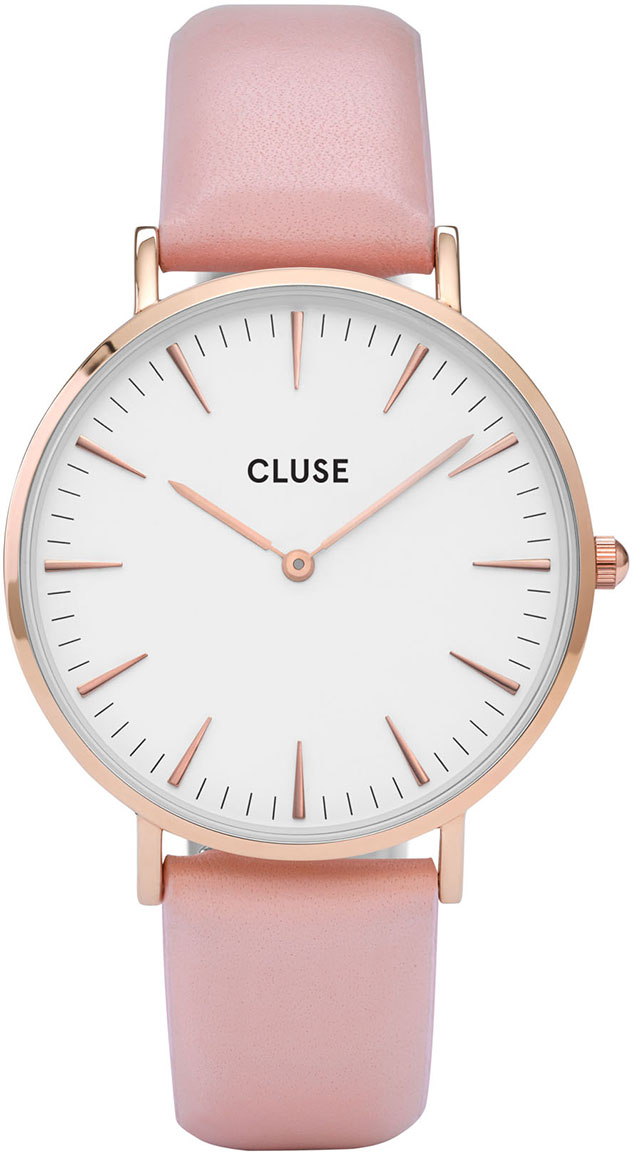 Cluse CL18014 La Boheme Rose Gold White/Pink -kellossa on kaunis pinkki nahkaranneke ja klassinen valkoinen kellotaulu. Kellon punakullan värisen rungon leveys on 38mm. Kellossa on Japanilaisen Miyotan valmistama laadukas Miyota 2025 paristokoneisto. Cluse kellot toimitetaan valmistajan alkuperäisissä pakkauksissa ja niille myönnetään 2 vuoden takuu.