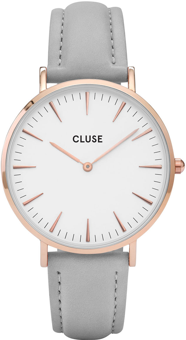 Cluse CL18015 La Boheme Rose Gold White/Grey -kellossa on muodikas harmaa nahkaranneke ja tyylikäs valkoinen kellotaulu. Kellon punakullan värisen rungon leveys on 38mm. Kellossa on Japanilaisen Miyotan valmistama laadukas Miyota 2025 paristokoneisto. Cluse kellot toimitetaan valmistajan alkuperäisissä pakkauksissa ja niille myönnetään 2 vuoden takuu.