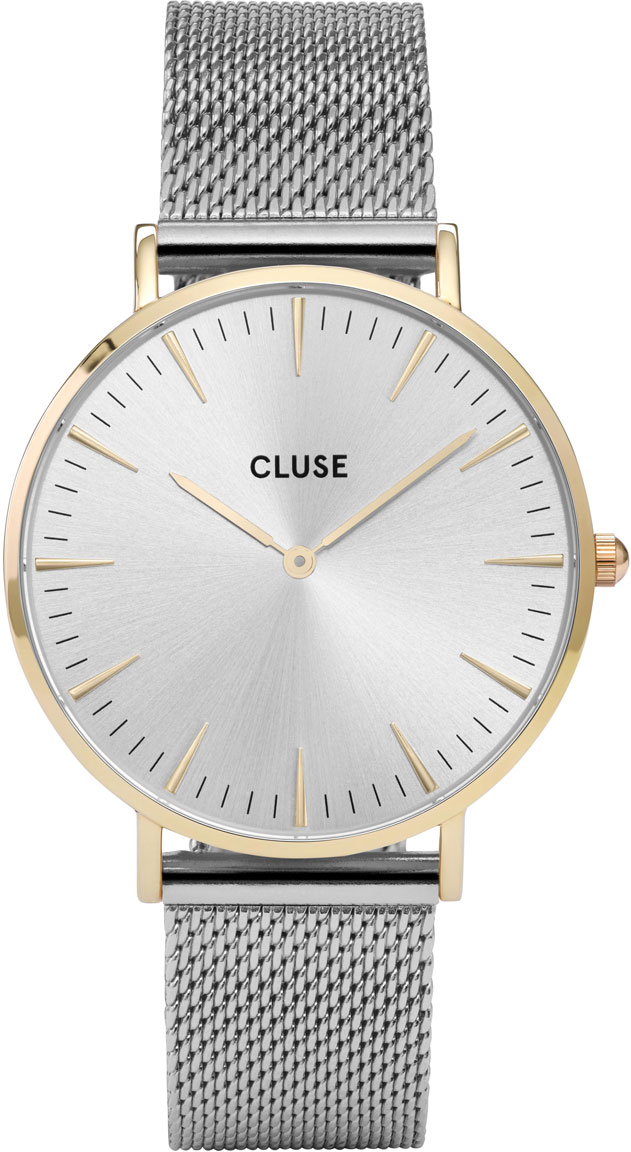 Cluse CL18115 La Boheme Mesh Gold/Silver -kellossa on on muodikas hopeanvärinen teräksinen mesh-ranneke ja tyylikäs hopeanvärinen kellotaulu. Kellon kullanvärisen rungon leveys on 38mm. Kellossa on Japanilaisen Miyotan valmistama laadukas Miyota 2025 paristokoneisto. Cluse kellot toimitetaan valmistajan alkuperäisissä pakkauksissa ja niille myönnetään 2 vuoden takuu.