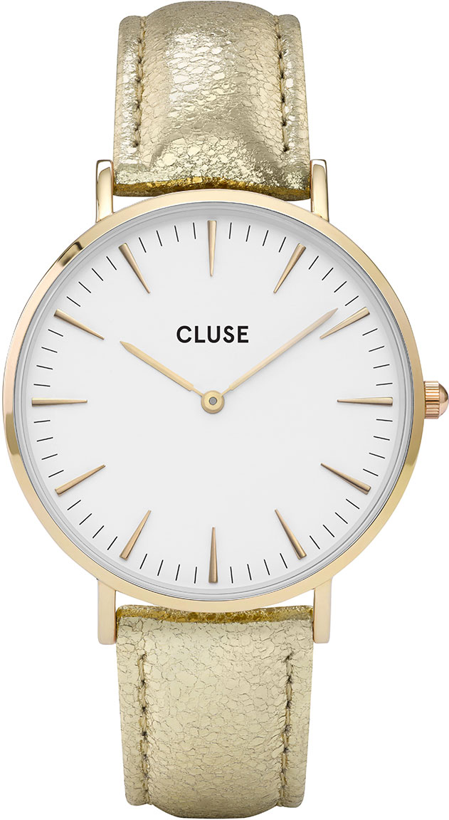Cluse CL18421 La Boheme Gold White/Gold Metallic -kellossa on näyttävä metallinhohtoinen kullanvärinen nahkaranneke ja tyylikäs valkoinen kellotaulu. Kellon kullanvärisen rungon leveys on 38mm. Kellossa on Japanilaisen Miyotan valmistama laadukas Miyota 2025 paristokoneisto. Cluse kellot toimitetaan valmistajan alkuperäisissä pakkauksissa ja niille myönnetään 2 vuoden takuu.