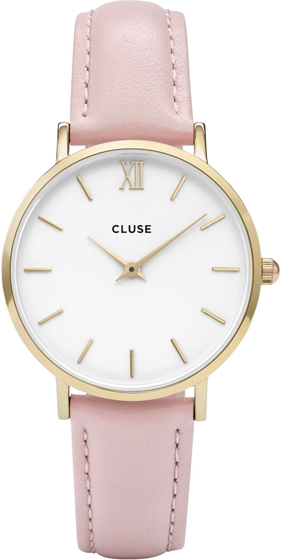 Cluse CL30020 Minuit Gold White/Pink -kellossa on pinkki nahkaranneke ja tyylikäs valkoinen kellotaulu. Kellon kullanvärisen rungon leveys on 33mm. Minuit kelloissa tyylikkäänä yksityiskohtana on roomalaisin numeroin esitetty klo 12 indeksi. Kellossa on laadukas Japanilainen paristokoneisto. Cluse kellot toimitetaan valmistajan alkuperäisissä pakkauksissa ja niille myönnetään 2 vuoden takuu.