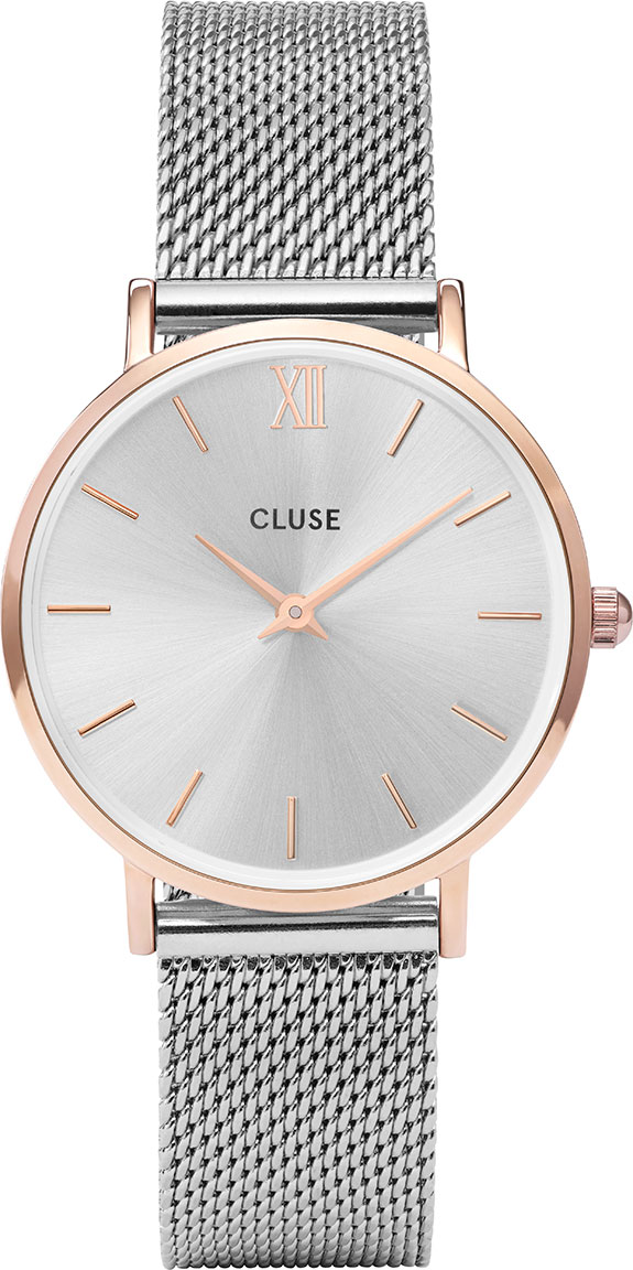 Cluse CL30025 Minuit Mesh Rose Gold/Silver -kellossa on teräksinen mesh-ranneke ja elegantti hopeanvärinen kellotaulu. Kellon punakullan värisen rungon leveys on 33mm. Minuit kelloissa tyylikkäänä yksityiskohtana on roomalaisin numeroin esitetty klo 12 indeksi. Kellossa on laadukas Japanilainen paristokoneisto. Cluse kellot toimitetaan valmistajan alkuperäisissä pakkauksissa ja niille myönnetään 2 vuoden takuu.