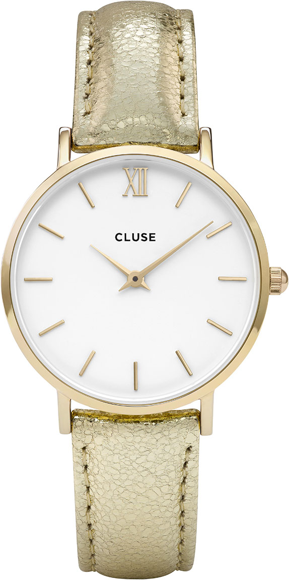 Cluse CL30036 Minuit Gold White/Gold Metallic -kellossa on metallinhohtoinen kullanvärinen nahkaranneke ja tyylikäs valkoinen kellotaulu. Kellon kullanvärisen rungon leveys on 33mm. Minuit kelloissa tyylikkäänä yksityiskohtana on roomalaisin numeroin esitetty klo 12 indeksi. Kellossa on laadukas Japanilainen paristokoneisto. Cluse kellot toimitetaan valmistajan alkuperäisissä pakkauksissa ja niille myönnetään 2 vuoden takuu.