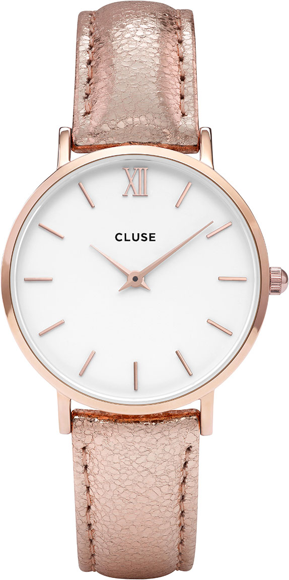 Cluse CL30038 Minuit Rose Gold White/Rose Gold Metallic -kellossa on metallinhohtoinen punakullan värinen nahkaranneke ja klassinen valkoinen kellotaulu. Kellon punakullan värisen rungon leveys on 33mm. Minuit kelloissa tyylikkäänä yksityiskohtana on roomalaisin numeroin esitetty klo 12 indeksi. Kellossa on laadukas Japanilainen paristokoneisto. Cluse kellot toimitetaan valmistajan alkuperäisissä pakkauksissa ja niille myönnetään 2 vuoden takuu.