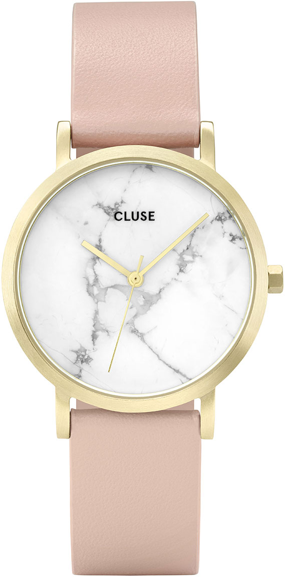 Cluse CL40101 La Roche Petite Gold White Marble/Nude -kellon kellotaulu on valmistettu valkoisesta marmorista. Jokainen kellotaulu on omannäköisensä marmorin luontaisten syiden vuoksi. Tässä mallissa lisäksi tyylikäs nudenvärinen nahkaranneke. Kellon kullanvärisen rungon leveys on 33mm. Kellossa on laadukas Japanilainen paristokoneisto. Cluse kellot toimitetaan valmistajan alkuperäisissä pakkauksissa ja niille myönnetään 2 vuoden takuu.