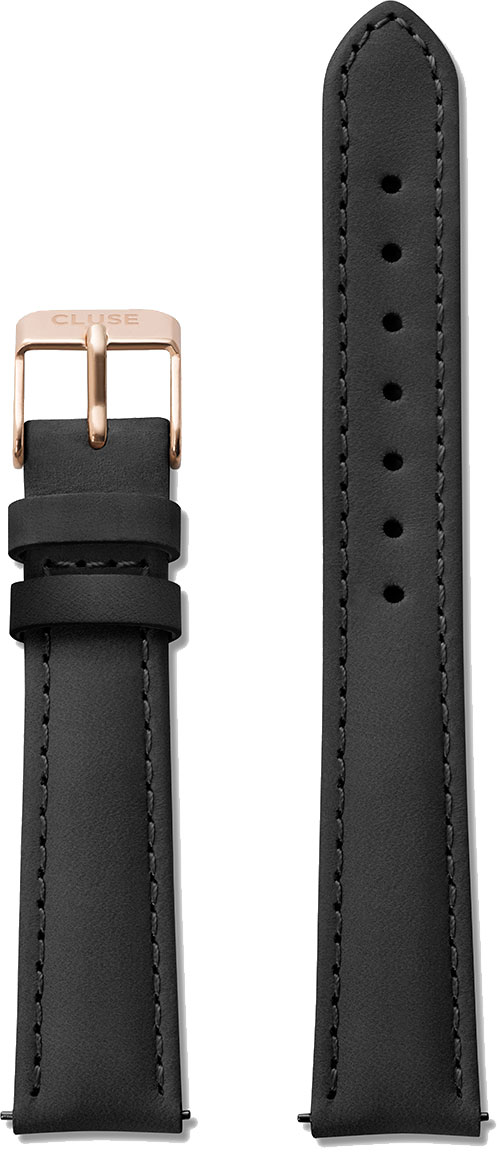 Cluse CLS301 Minuit Black-Rose Gold ranneke 16mm. Ranneke on suunniteltu Clusen Minuit ja La Petite Roche sarjan kelloihin mutta se sopii myös muihin kelloihin, joissa rannekkeen leveys kiinnityskohdasta on 16mm. Rannekkeessa on kätevä pikalukitus jolla sen saa nopeasti ja kätevästi vaihdettua. Tässä mustassa nahkarannekkeessa on ruusukullan värinen solki.
