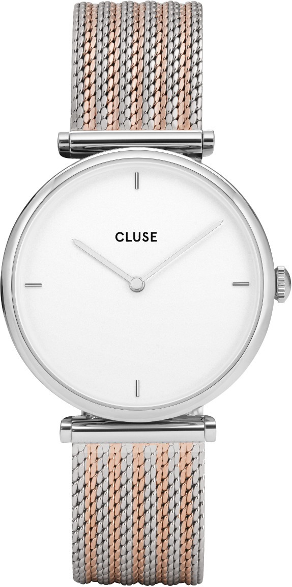 Cluse Triomphe CL61001 Silver on kiehtovan designin omaava rannekello, joka kääntää katseita tyylikkäällä kaksivärisellä rannekkeellaan ja elegantilla valkoisella kellotaulullaan. Kellon runko on 33 mm leveä ja valmistettu messingistä. 16 mm leveän teräsrannekkeen voi helposti vaihtaa myös Minuit -sarjan rannekkeisiin.