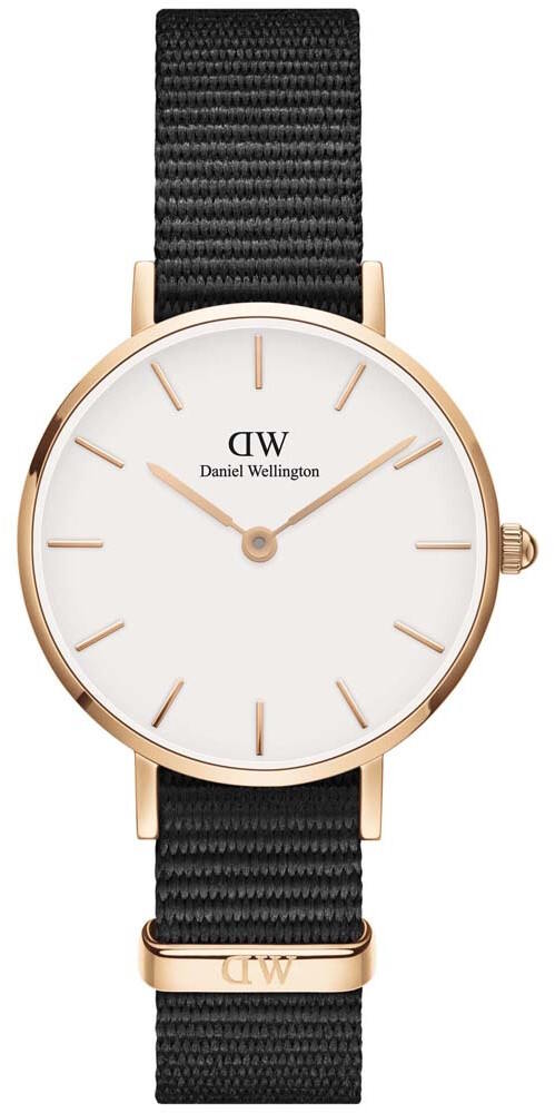 Daniel Wellington Classic Petite Cornwall DW00100251 -rannekello on minimalistisen rento ajannäyttäjä. Kellon runko on valmistettu punakultapinnoitteitusta ruostumattomasta teräksestä ja musta Nato-ranneke on kangasta. Kellon rungon leveys on 28mm ja paksuus 6.3mm. Rannekkeen leveys kiinnityskohdassa on 12mm. Daniel Wellington -kelloille myönnetään 2 vuoden takuu ja ne toimitetaan valmistajan alkuperäisessä rasiassa.