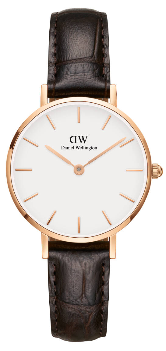 Daniel Wellington Classic Petite York RG 28mm DW00100232 -rannekello on rennon tyylikäs ajannäyttäjä. Kellon runko on valmistettu punakullan värisestä ruostumattomasta teräksestä ja kellon tummanruskea krokotiilikuvioitu ranneke on aitoa nahkaa. Kellon rungon leveys on 28mm ja paksuus 6mm. Rannekkeen leveys kiinnityskohdasta on 12mm. Daniel Wellington -kelloille myönnetään 2 vuoden takuu ja ne toimitetaan valmistajan alkuperäisessä rasiassa.