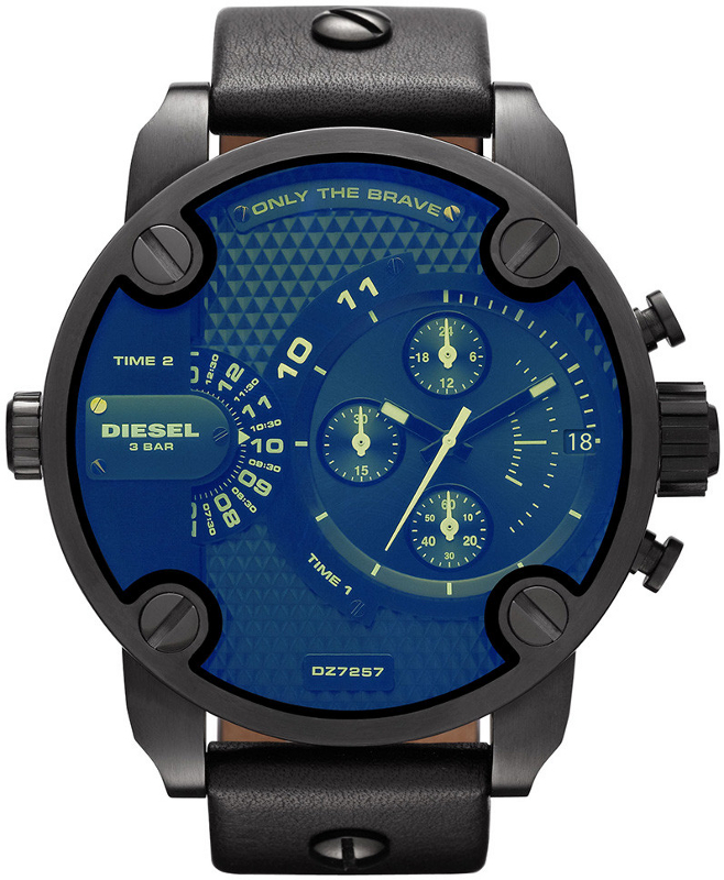 Astetta rajumpi Diesel DZ7257 Dual-Time Chronograph rannekello. Kellon mustaksi pinnoitettu runko on leveydeltään 51mm, ja nuppien kanssa 60mm. Mustan nahkarannekkeen leveys on 24mm. Rannekellon taulun väri on musta, mutta sen kellolasi heijastaa violettia väriä. Kello voidaan asettaa käymään kahden eri aikavyöhykkeen aikaa yhtäaikaisesti sillä kellossa on 2 erillistä kelloa! Kellosta löytyy myös ajanotto sekä päivyri ominaisuudet. Diesel kelloille myönnetään 2 vuoden takuu. Tuote toimitetaan valmistajan alkuperäisessä rasiassa.