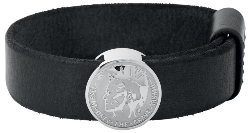 Miesten Diesel DX0716 rannekoru. Koru on nahkaa ja ruostumatonta terästä ja se on mustan/hopean värinen. Helan halkaisija on 24mm ja rannekkeen leveys on 19mm. Koru on säädettävissä 14-23cm mittaiseen ranteeseen.