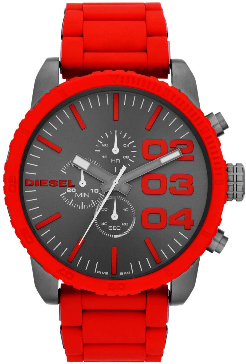 Diesel DZ4289 Double Down Chrono kellossa on näyttävä puanisella kumillä paallystetty teräsranneke. Rungon leveys on 51mm ja paksuus 13mm. Rannekkeen leveys kiinnityskohdasta on 26mm. Ominaisuutena ajanotto. Diesel kelloille myönnetään 2 vuoden takuu ja ne toimitetaan valmistajan alkuperäisessä rasiassa.