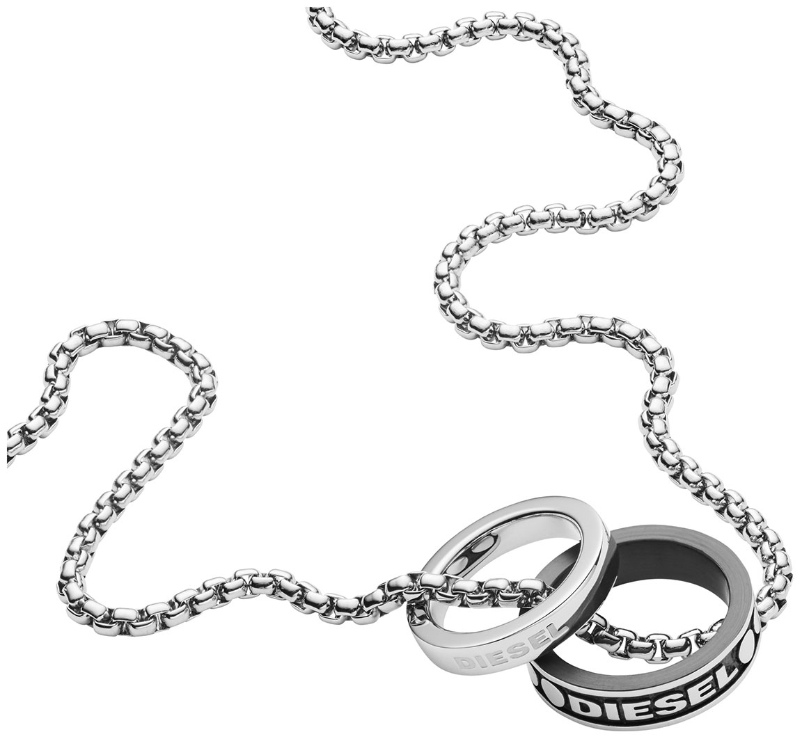 Miesten Diesel Double Pendant DX1168040 -kaulakoru on valmistettu ruostumattomasta teräksestä. Kaulakorun pituus on 55 + 5 cm. Riipuksena toimii kaksi "sormusta", joista toinen on hopea ja toinen musta. Kiinnitys helppokäyttöisellä hummerilukolla. Diesel-korut toimitetaan valmistajan alkuperäisessä pakkauksessa.